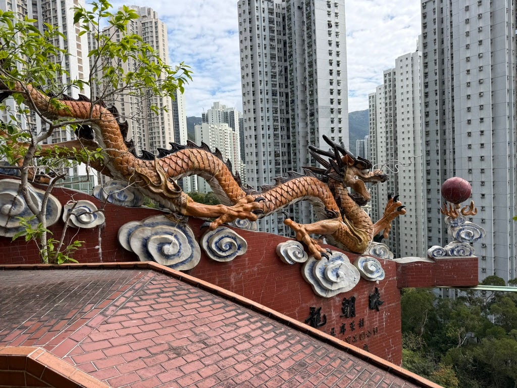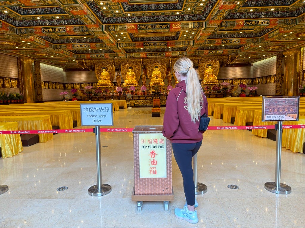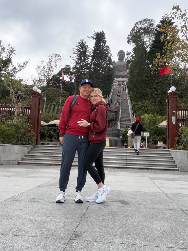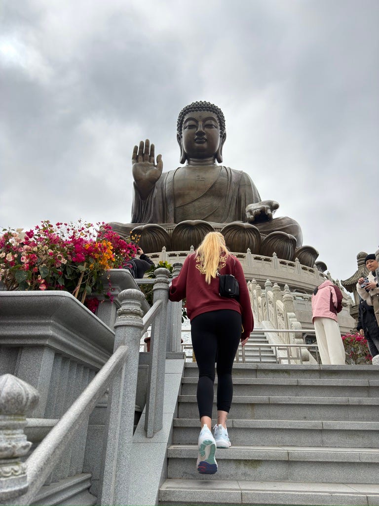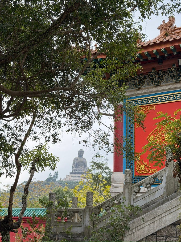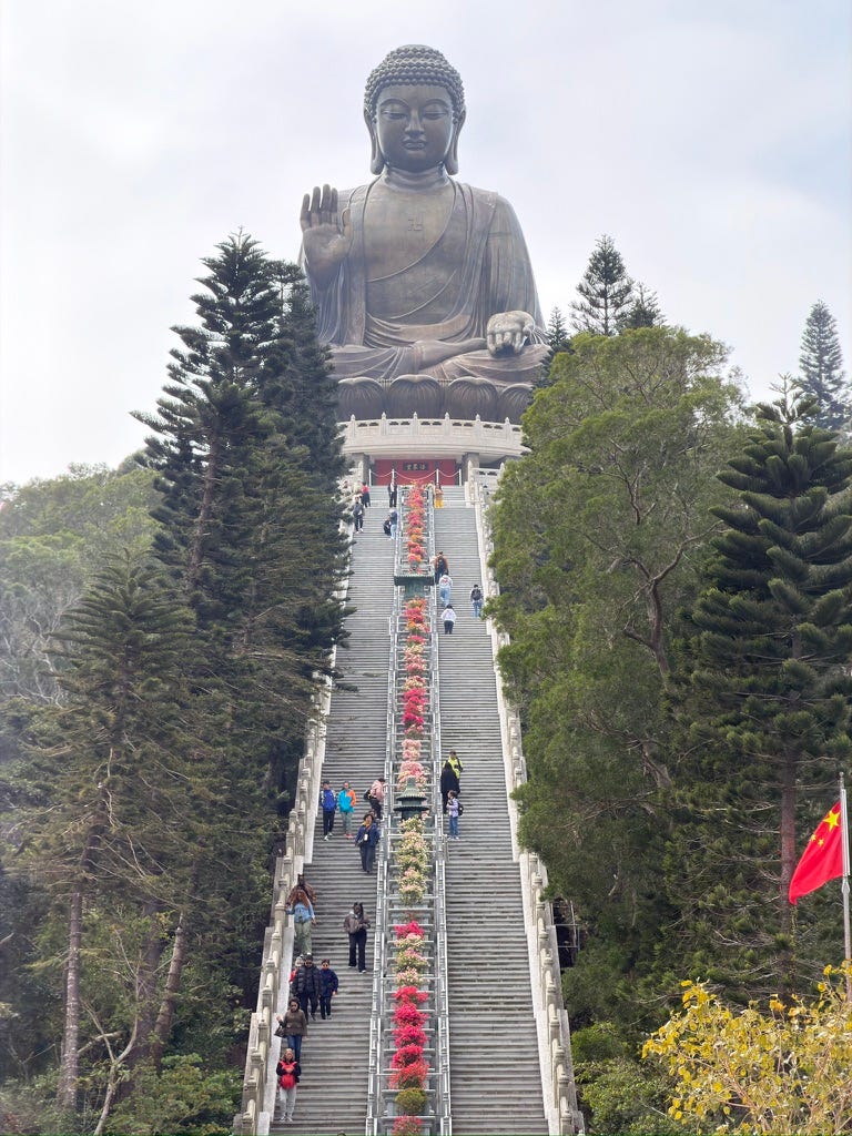 In the days that followed, my husband and I went to the Big Buddha on Lantau Island. We climbed the steps together, breath by breath, leg by leg, surrounded by sky and stone and silence. We spent the day there…not searching for answers, but for steadiness. For something solid enough to lean against when everything else felt like it was slipping.